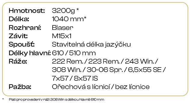 Vynikající ergonomie a vyvážení zbraně, pažba z kvalitního ořechového dřeva, možnost další customizace